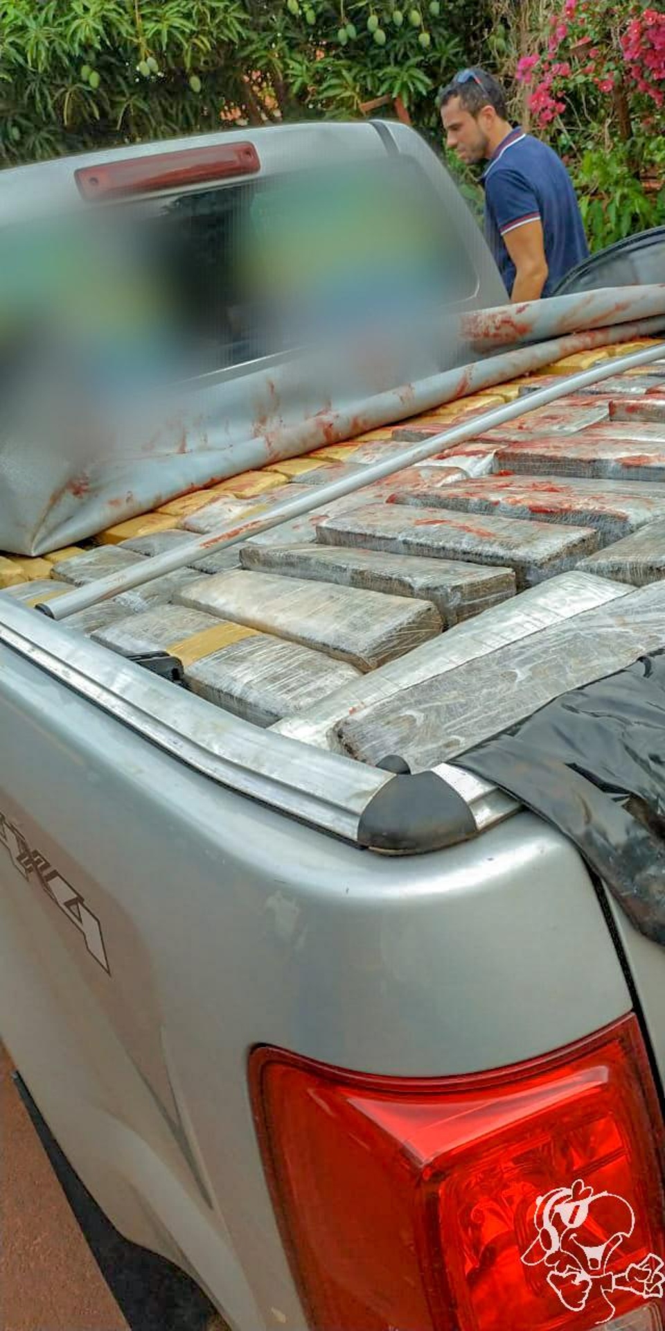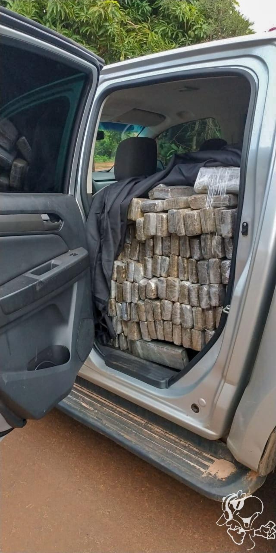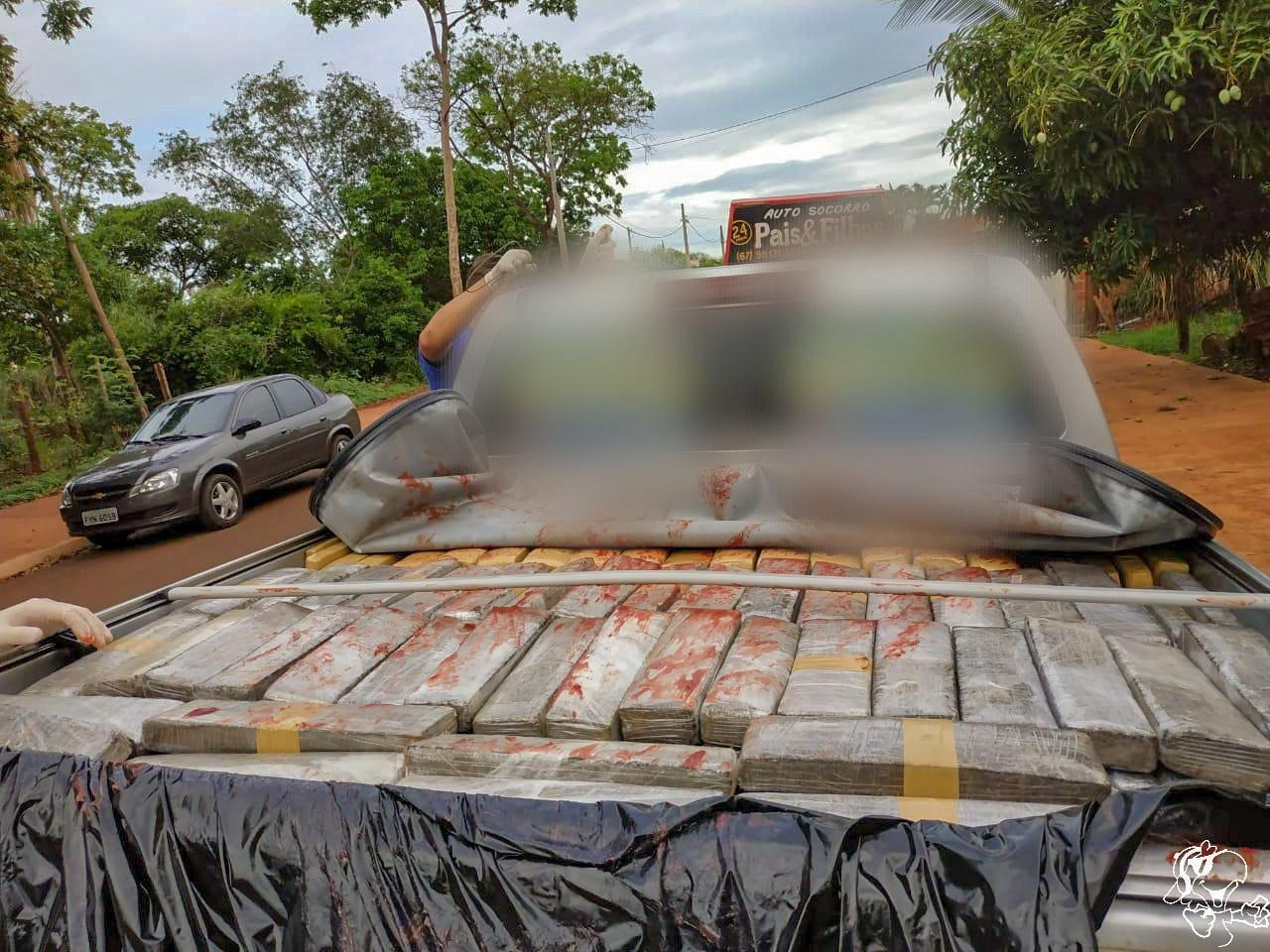 Durante busca no veículo, foram encontrados um celular e cerca de 1.500 tabletes de maconha, que pesaram 1,5 tonelada. Após verificação, também foi possível constatar que o veículo estava com a placa adulterada. A droga e a caminhonete foram apreendidas.