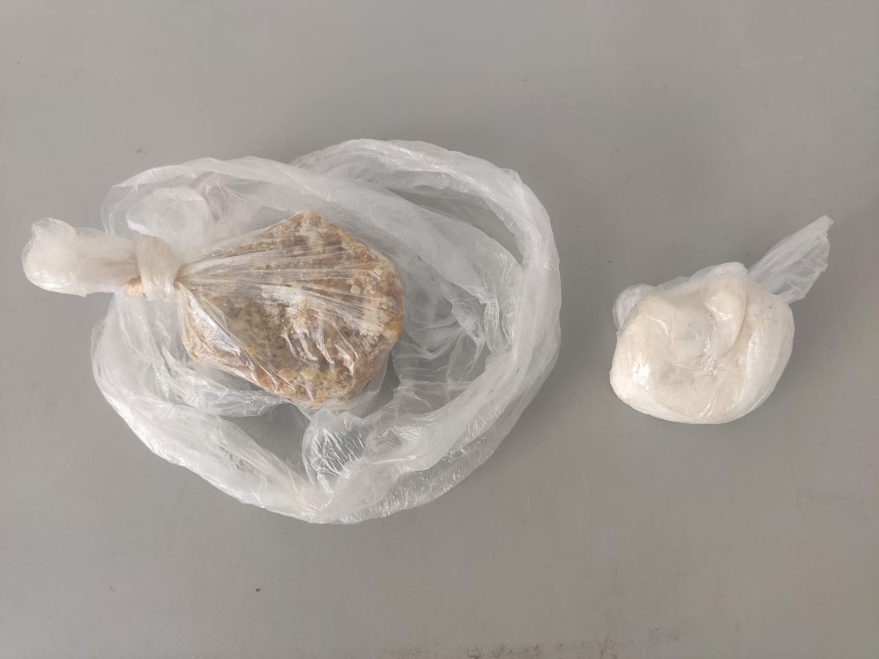 Ao lado de uma bananeira, foi localizada uma sacola plástica com dois invólucros plástico contendo entorpecentes. Um deles continha 149 gramas de crack e em outro 64 gramas de cocaína. A droga foi entregue na delegacia para providências.