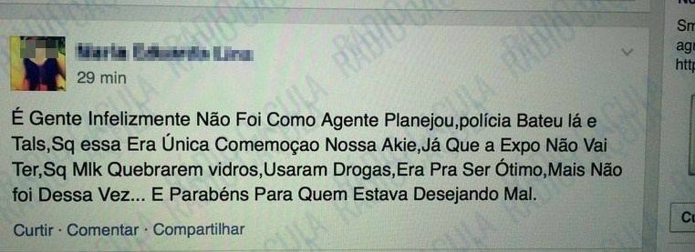 O principal suspeito de ser o organizador já está sendo procurado pela polícia. Notícias do paradeiro do jovem podem ser informadas via 190.