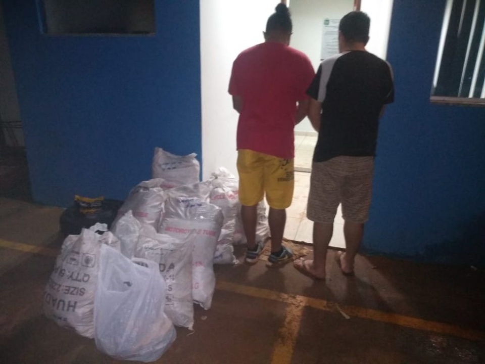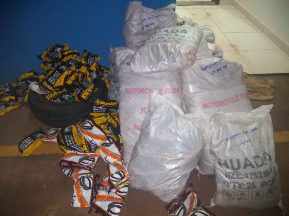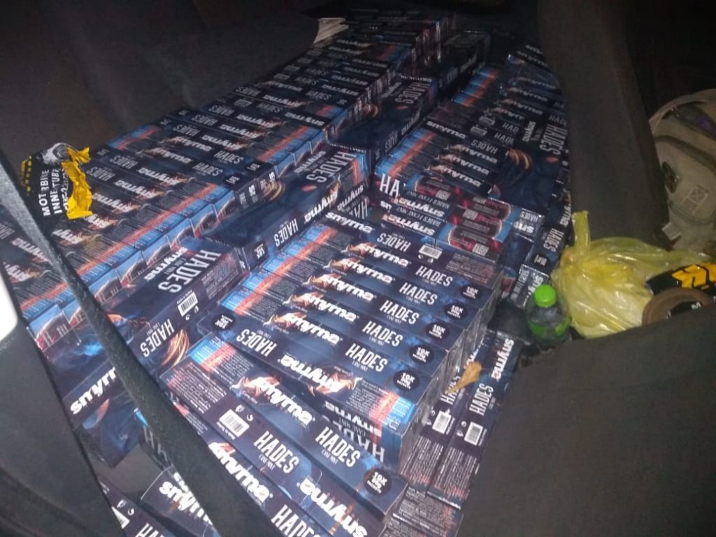 Nesse momento a guarnição logrou êxito em abordar os ocupantes, sendo o condutor de 37 anos e o passageiro de 30 anos. Durante a revista veicular foram encontrados 14 sacos de câmara de ar para motocicleta, mais 15 câmaras a granel, bem como, aproximadamente 160 caixas de essências para narguilé, todas as mercadorias foram trazidas do Paraguai sem as notas fiscais.
