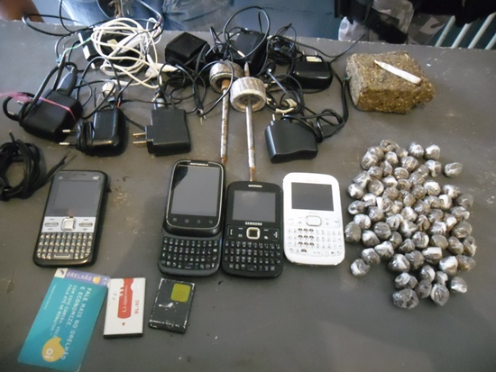 A guarnição encontrou dentro das celas um aparelho celular, um cigarro de maconha, quatro carregadores de celular, uma bateria de celular e um cartão de orelhão.