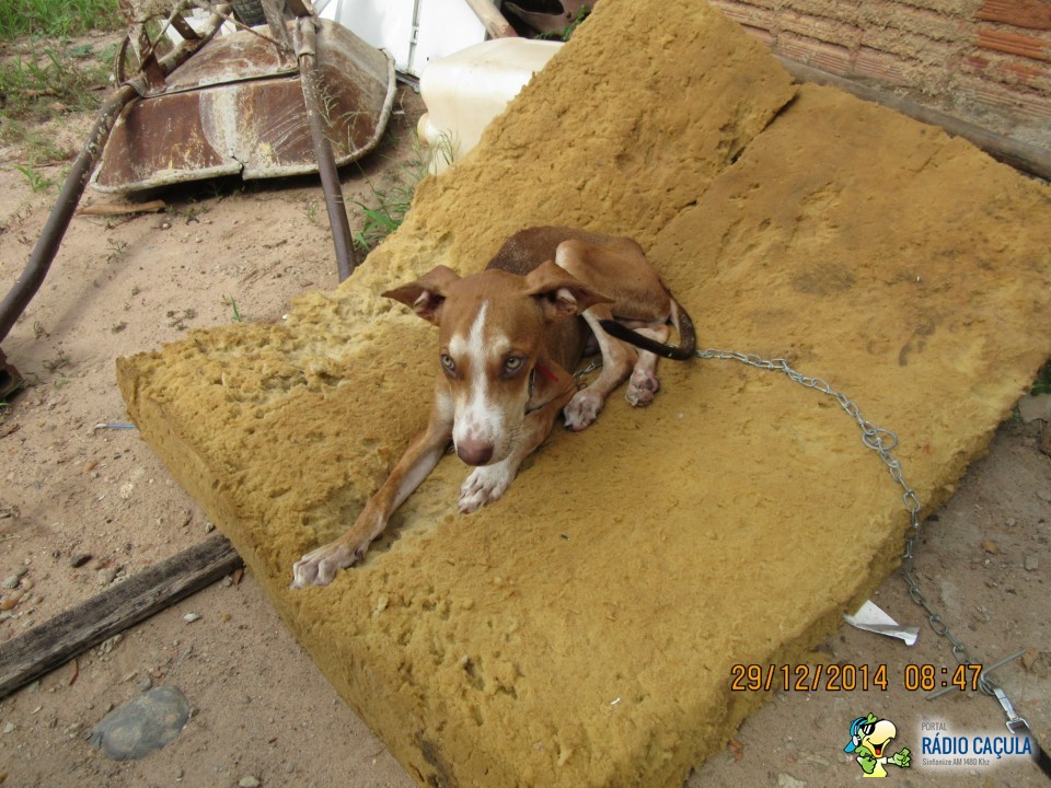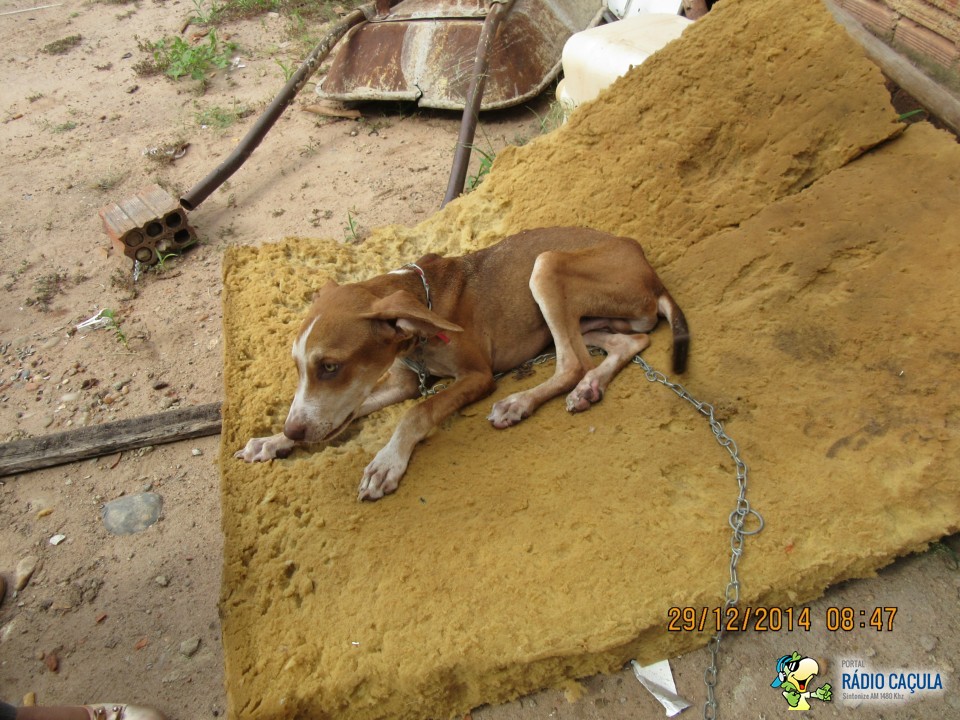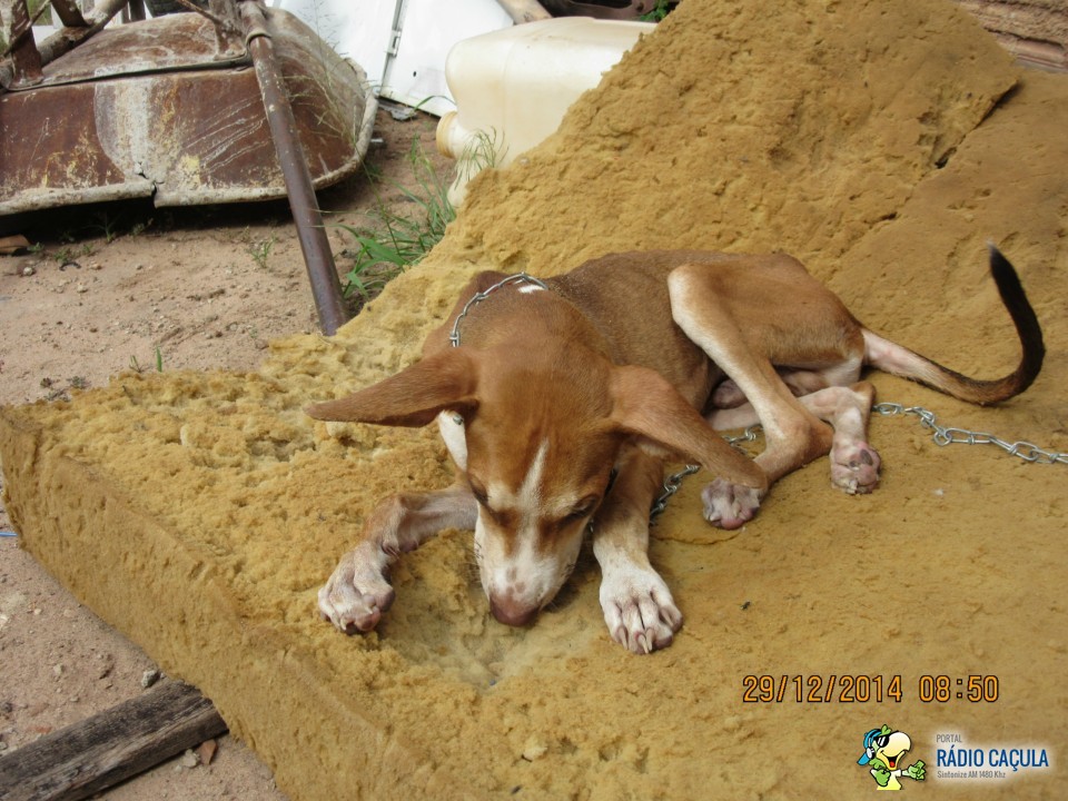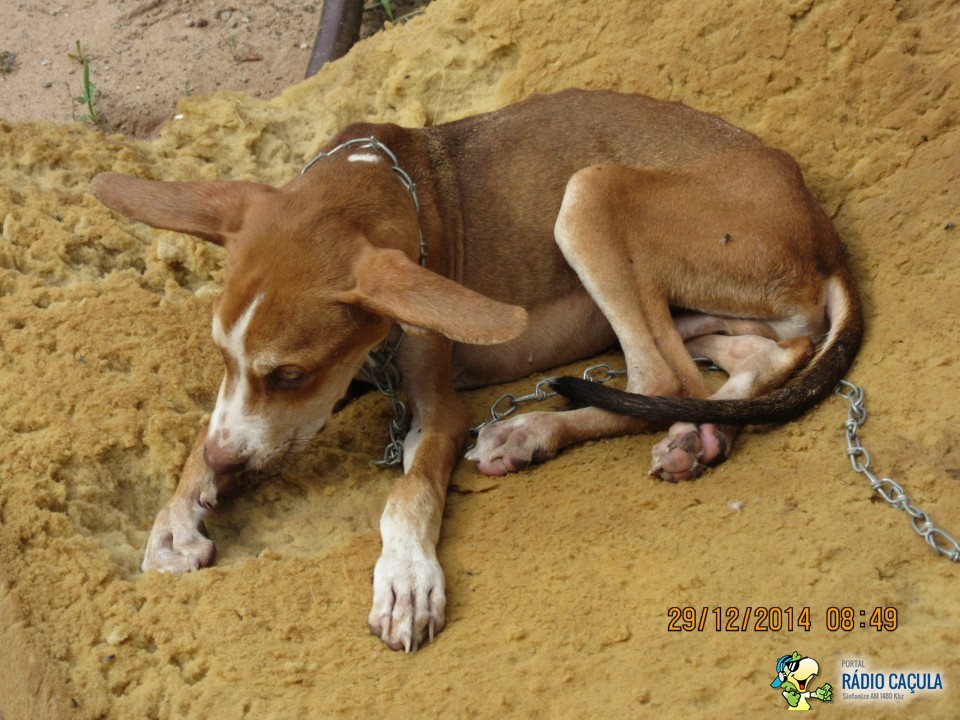 Ao chegarem no local encontraram um cãozinho ainda filhote amarrado com uma corrente presa ao muro, com a aparência bem debilitada, cercado de moscas, com diversas manchas e com os pelos cobertos de areia.