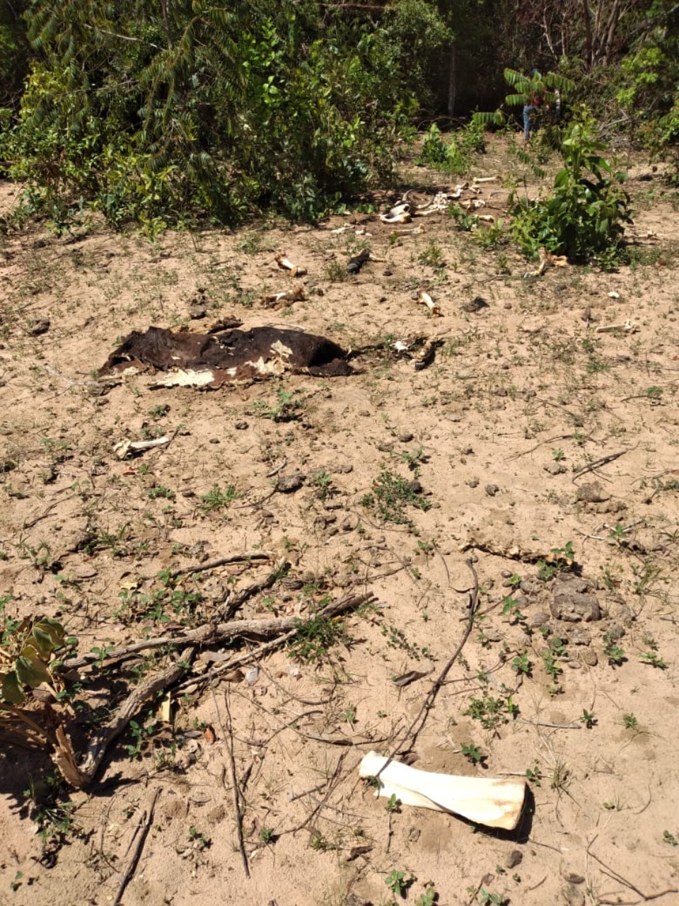 Durante vistoria realizada, a polícia localizou quatro carcaças de bovinos, além de 20 vacas paridas bastante magras e sem nada para comer. A única vegetação presente no local é erva daninha.
