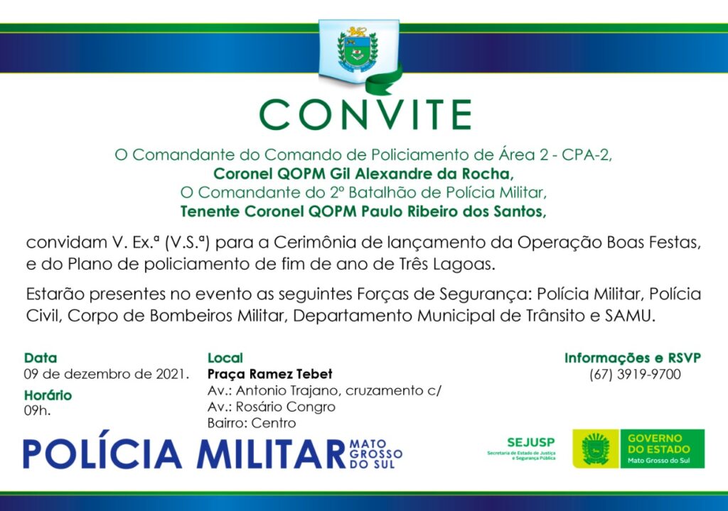 O Comando do 2º Batalhão da Polícia Militar lançará nesta quinta-feira (9), a ‘Operação Boas Festas’ e o plano de policiamento de fim de ano em Três Lagoas.