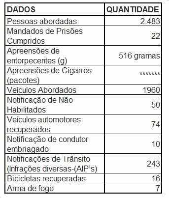 A intensificação das rondas, abordagens e blitz de trânsito promovidas pelos policiais do 2º batalhão de Polícia Militar durante o mês de Outubro resultaram na abordagem de mais de duas mil pessoas, retirou de circulação vinte e duas pessoas em dívida com a justiça, alem de recuperar diversos veículos e bicicletas produtos de crime, apreensão de entorpecentes e armas de fogo.