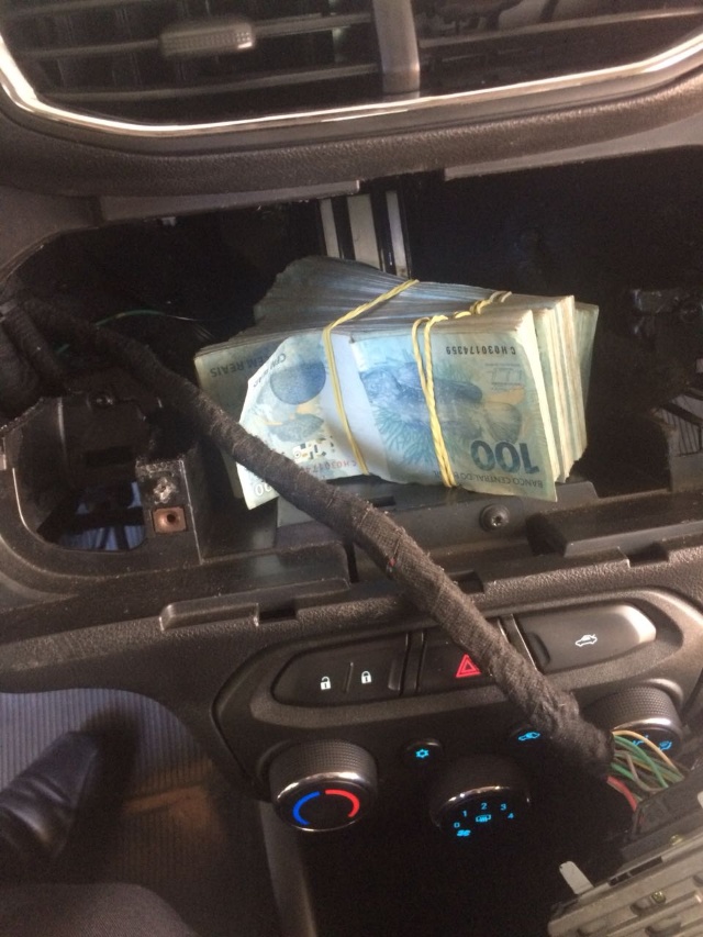 Acompanhada de uma criança, a mulher saiu do banco com uma bolsa e uma sacola e se dirigiu até um carro, estacionado no banco. Após ela sair do veiculo, a polícia abordou o motorista, de 23 anos. Ele negou qualquer irregularidade, mas durante vistoria, a polícia identificou um compartimento falso no veículo, onde estava escondida a quantia de R$ 50 mil.