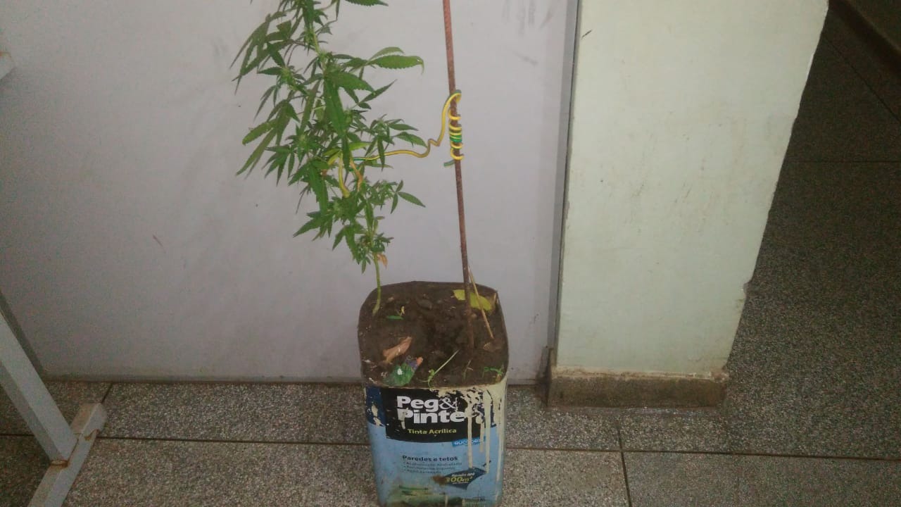 Questionado sobre a casa onde se encontrava, ele informou ser de um homem de 33 anos, que chegou ao local durante a abordagem. Os policiais, ao olharem pelo portão, viram uma lata com um pé de maconha de aproximadamente 50 centímetros.
