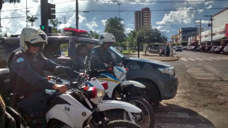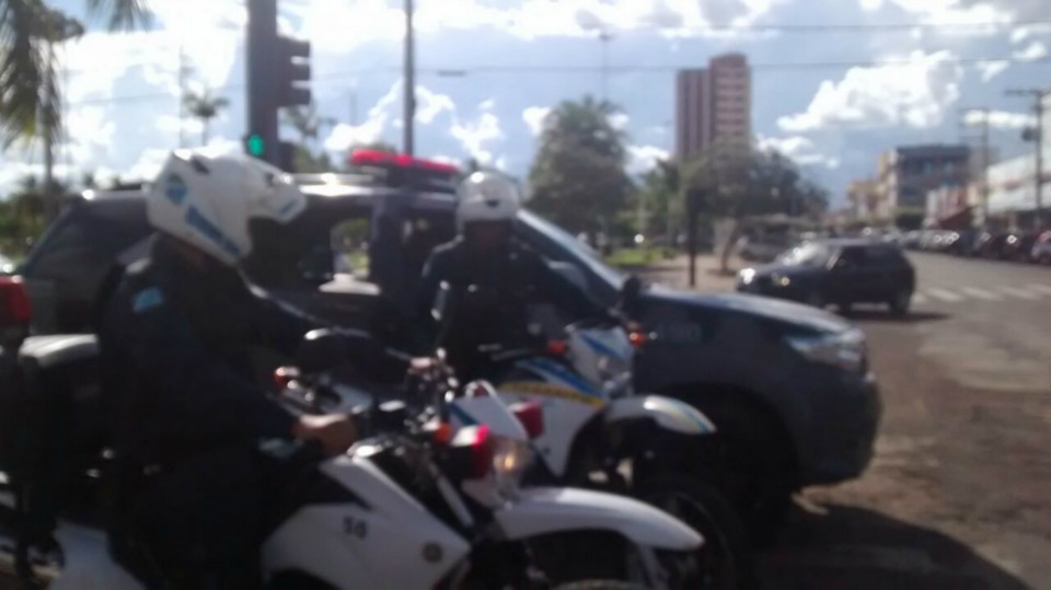 Os policiais estavam estacionados próximos ao relógio central juntamente com suas viaturas.