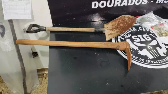 A pá e a picareta foram encontradas pela polícia na casa de Laura Negrão de Assis, 24, na Rua Adroaldo Pizzini, onde seis dos sete envolvidos estavam escondidos. Laura teve a prisão preventiva negada pela Justiça e já está em liberdade. Bruno Gentil foi preso em Itaporã, onde mora.
