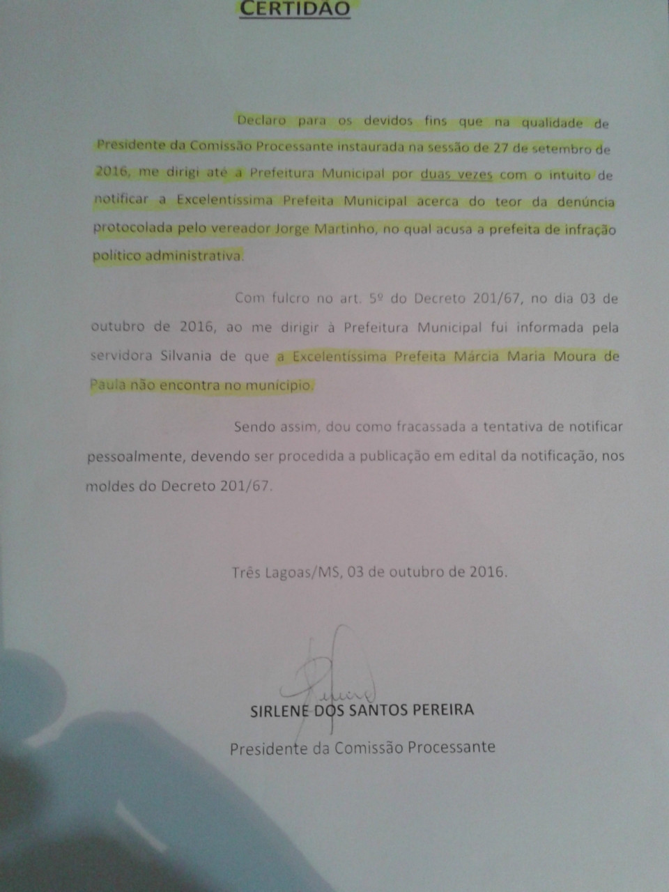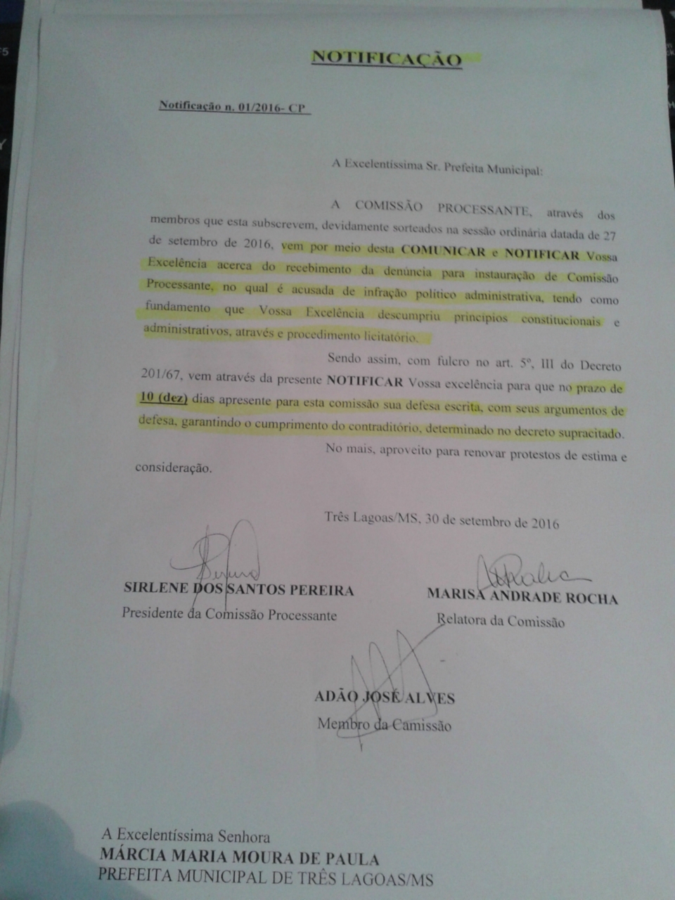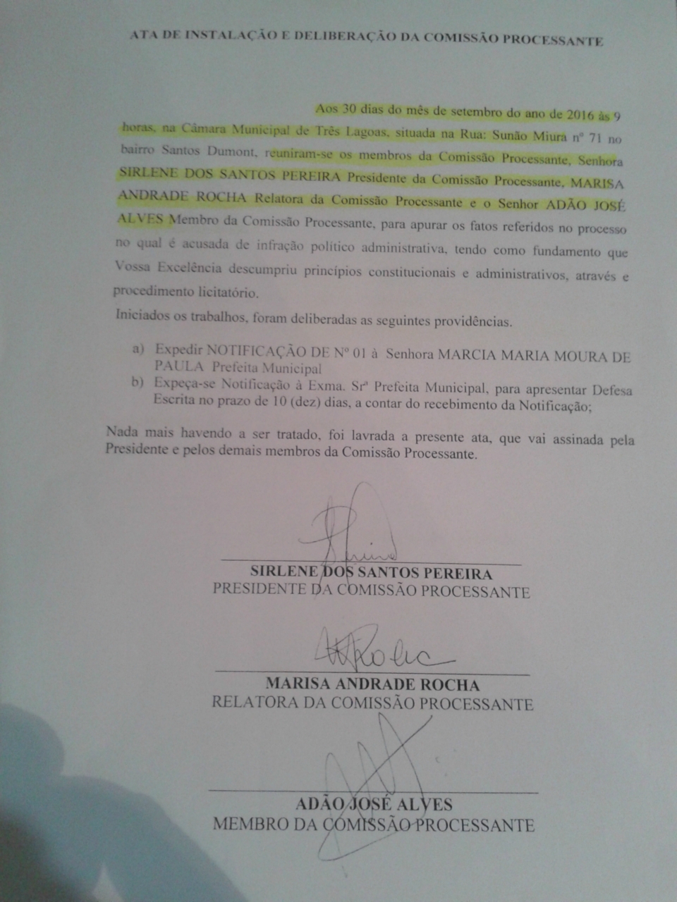 Os vereadores Sirlene dos Santos, Marisa Rocha e Adão José Alves assinaram devidamente a notificação e fazem parte da Comissão Processante.