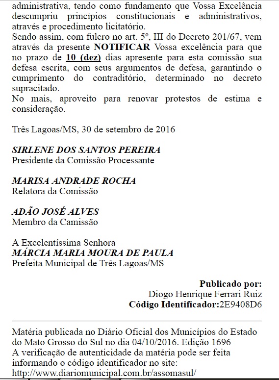 O documento também foi publicado no diário oficial da Assomasul (Associação dos Municípios do Mato Grosso do Sul), no dia 04 de outubro de 2016.