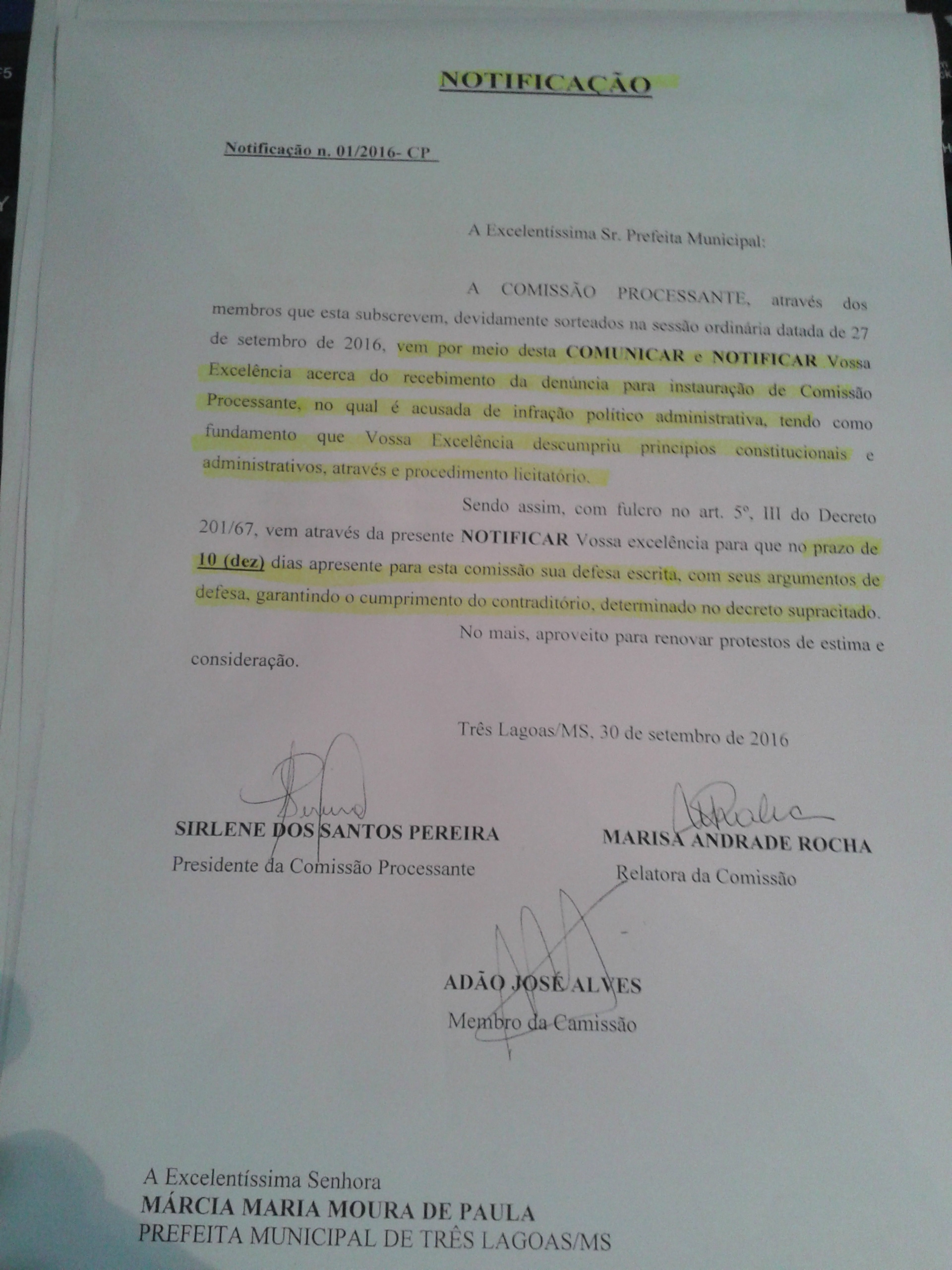 A Prefeita tem 10 dias a partir da data de notificação para produzir sua defesa escrita e argumentativa, sendo assim o documento datado no dia 30 de setembro, terá que ser cumprido até o dia 10 de outubro de 2016.