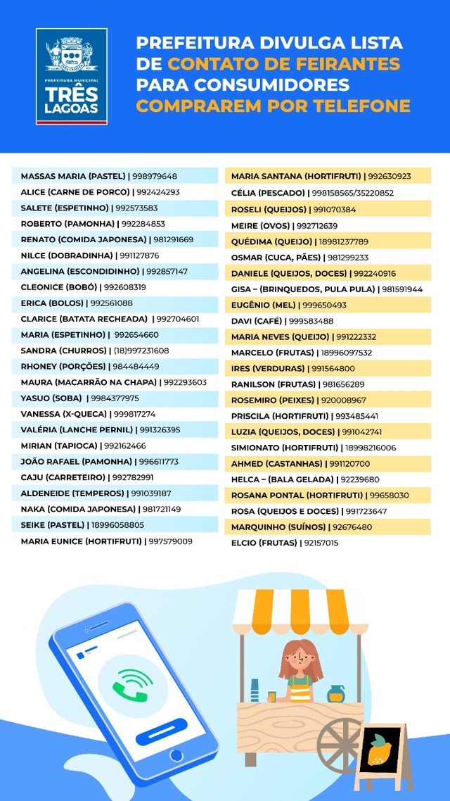 Para contribuir com o direito de compra do consumidor e evitar maior prejuízo aos produtores e vendedores, a Secretaria Municipal de Desenvolvimento Econômico, Ciência e Tecnologia (SEDECT) está divulgando a lista de contatos dos feirantes para que a população adquira produtos por entrega ou buscando “in loco”. Vale lembrar que, alguns produtos podem ser encomendados com antecedência.