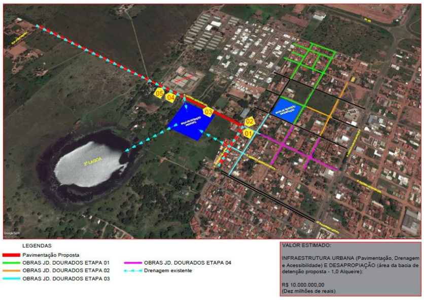 Uma vez sabendo que não é uma alternativa a ser considerada a aplicação do asfalto no local, de imediato, a Prefeitura tem buscado a solução para o caso. O que tanto a Diretoria de Planejamento quanto a SEINTRA sabem é que uma obra de drenagem é necessária. Isso inclui a construção de pelo menos mais uma bacia de amortização com dimensão de um alqueire, uma vez que já está em fase final a construção de bacia no Jardim Dourados, que colaborará com a drenagem da região.