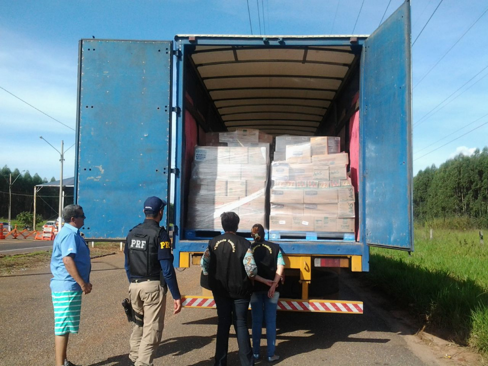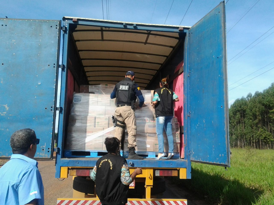 Durante inspeção da carga para fins de fiscalização de trânsito, os PRF’s constataram o transporte de um carregamento do produto perigoso aerossóis (gás inflamável) juntamente com 8 toneladas de produtos alimentícios.