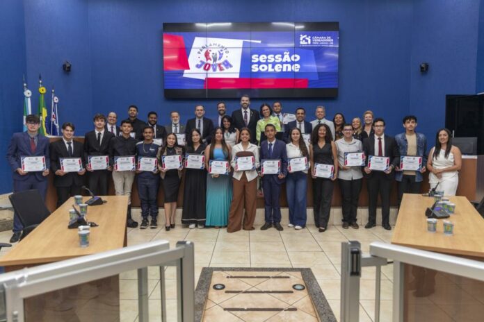 O encerramento da primeira edição do programa Parlamento Jovem da Câmara de Vereadores de Três Lagoas foi realizado com uma sessão solene, na noite desta quarta-feira (17), ocasião em que foram oferecidas homenagens aos jovens vereadores e em que eles também conferiram homenagens aos vereadores, seus padrinhos, às suas escolas e a pessoas que desempenharam importante papel nesta etapa histórica de suas vidas.