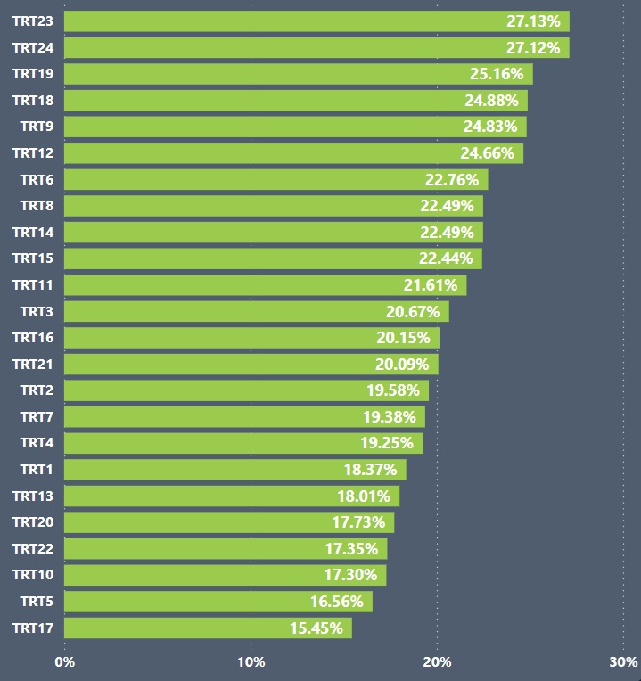 Ainda de acordo com o CNJ, considerando os tribunais com jurisdição na região Centro-Oeste, o maior índice de conciliação foi registrado pelo TRT23, de Mato Grosso, com 27,13%, seguido pelo TRT24, de Mato Grosso do Sul, com 27,12%, e pelo TRT18, de Goiás, com 24,88%. Já o TRT10, que abrange o Distrito Federal e o Tocantins, registrou índice de 16,13%. Veja no gráfico a seguir o detalhamento desta visão: