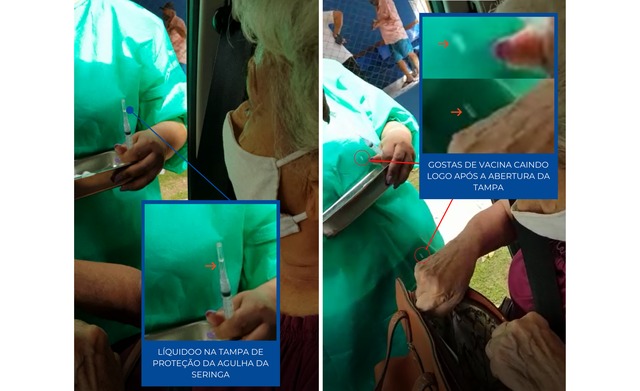 No vídeo, gravado pelo familiar da idosa no momento do atendimento, é possível notar que, antes mesmo da aplicação da dose no braço da paciente, há um líquido na tampa de proteção da agulha da seringa e, também nota-se que, quando a profissional retira a proteção, gotas caem logo na sequência. Desse modo, é possível constatar que houve um erro no manuseio da seringa que fez com que o líquido saísse antes da hora.