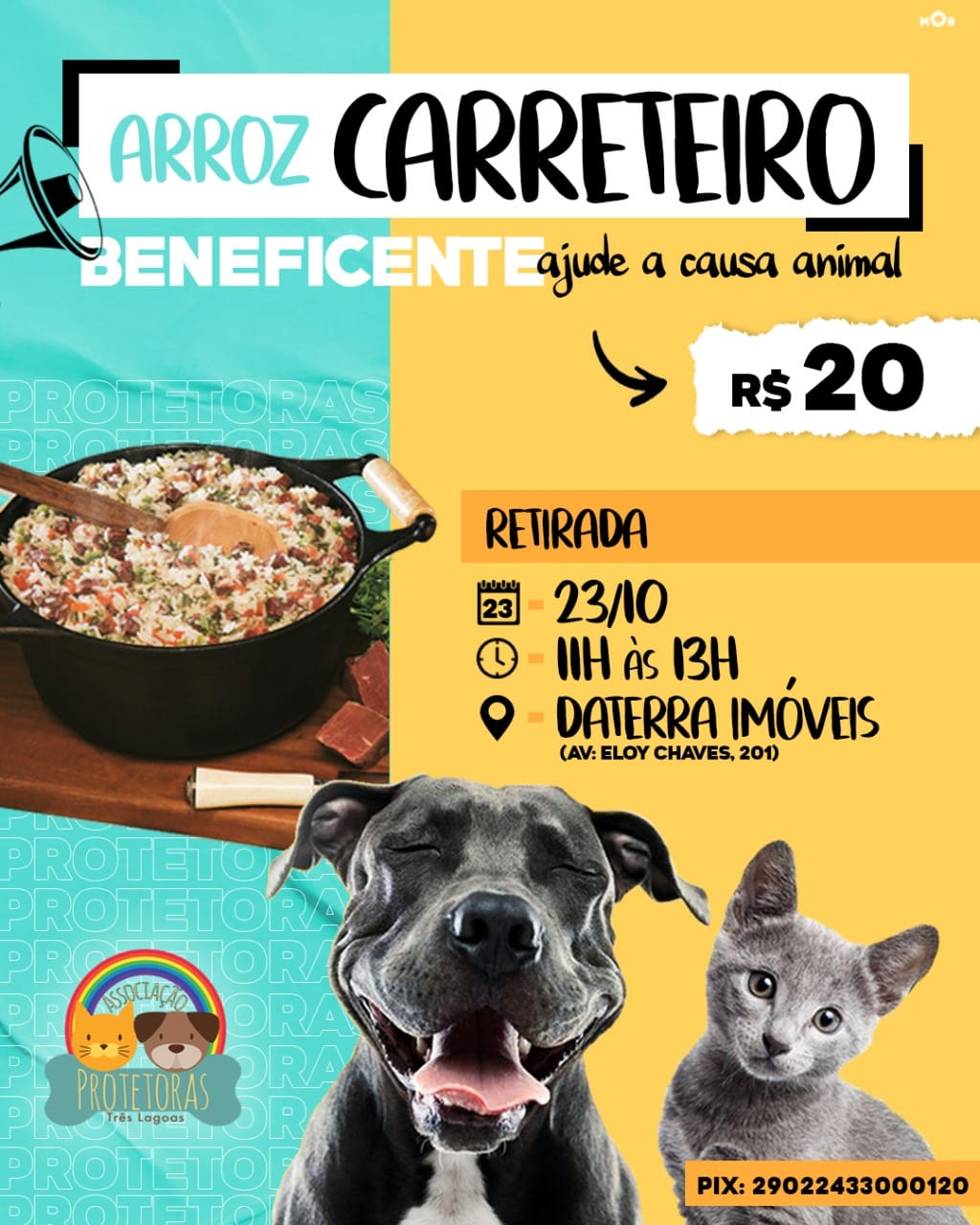As Protetoras dos Animais de Três lagoas, promovem um arroz carreteiro no dia 23 de outubro, uma campanha para ajudar na assistência de animais resgatados.
