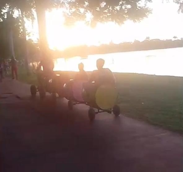 No final da tarde deste sábado, frequentadores da orla da Lagoa Maior, em Três Lagoas, presenciaram uma cena inusitada: um quadriciclo puxando latões adaptados de forma artesanal, formando um “trenzinho” improvisado, com duas crianças sendo transportadas. O passeio ocorreu sobre a pista de saúde da lagoa, espaço destinado exclusivamente à prática de atividades esportivas.