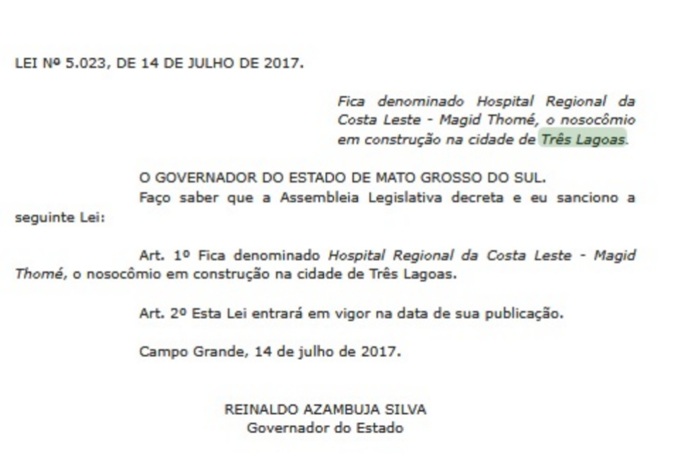 Foi sancionada também no Diário Oficial a lei que denomina de ‘Hospital Regional da Costa Leste – Magid Thomé’ o hospital em construção.