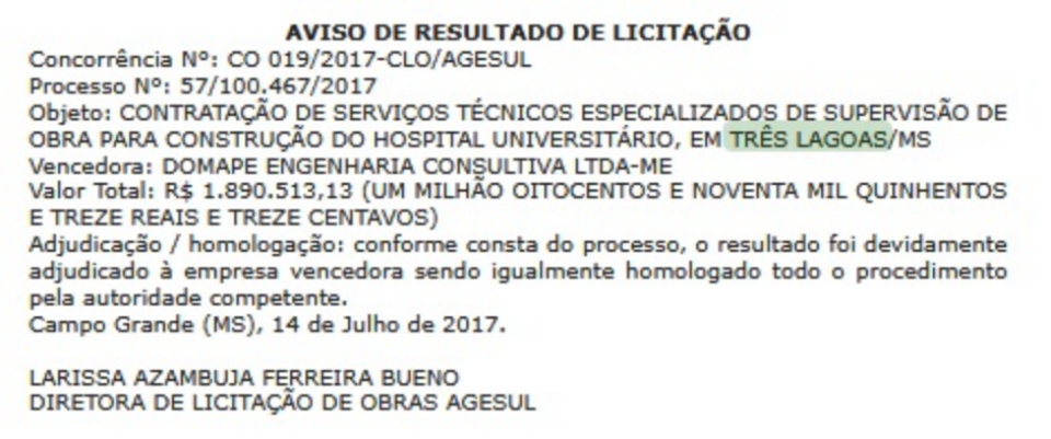 A empresa Domape Engenharia Consultiva Ltda vai receber R$ 1.890.513,13 (um milhão oitocentos e noventa mil quinhentos e treze reais e treze centavos) para supervisionar a obra de construção do Hospital Universitário de Três Lagoas.