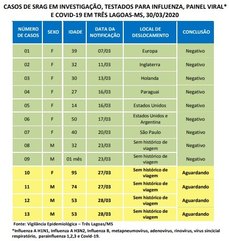 TRÊS LAGOAS (MS) – A prefeitura de Três Lagoas, por meio da Secretaria Municipal de Saúde (SMS), divulgou na tarde desta segunda (31) o Boletim Diário informando sobre casos suspeitos de COVID-19 na Cidade.