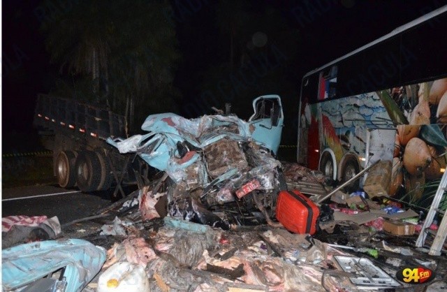 O caminhão Mercedes Benz com placas de Campo Grande estava carregado com couro e ficou completamente destruído. O ônibus teve a parte dianteira destruída. A colisão frontal ocorreu nas proximidades da Fazenda Recreio.