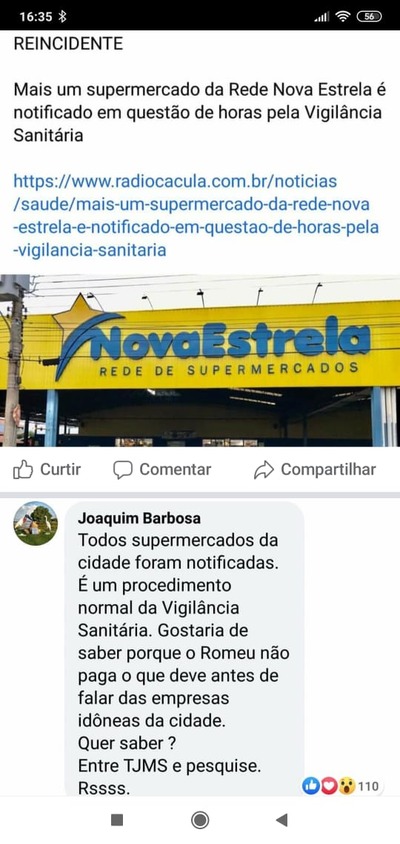 TRÊS LAGOAS (MS) – Depois das acusações e imputação de crime feita pelo Diretor da Rede de Supermercados Nova Estrela – Joaquim Romero Barbosa – através de uma “Live” transmitida pelo Facebook, a Rádio Caçula através de seus representantes, Sr. Romeu de Campos Junior e Sra. Antonia Aparecida de Campos (Ambos Jornalistas) registraram na data de hoje, Boletim de Ocorrência N.º 531/2020 na Delegacia de Polícia Civil de Três Lagoas.