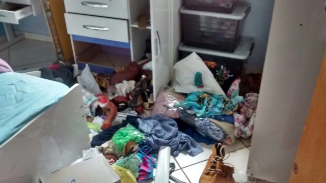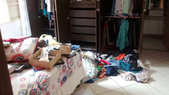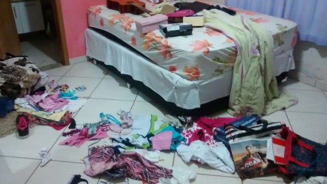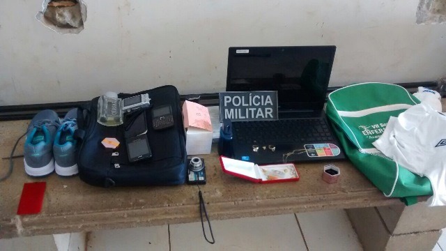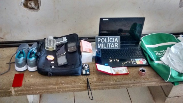Em checagem no local do furto, foi observado que o suspeito entrou em todas as dependências da residência, jogando tudo no chão e separado em duas mochilas 01 notebook da marca Positivo munido de carregador de bateria, 01 par de meias, Camisas, tênis, aparelho celular, frasco de perfume, câmera fotográfica digital e joias.