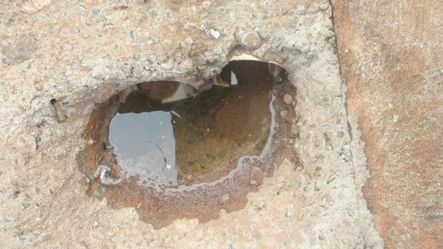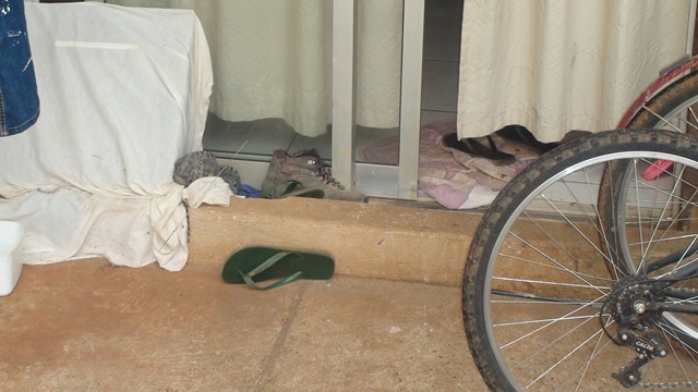No bloco N, apartamento 104, mora a família da Sra. Andréia Brandão. Além do comprometimento do forro do banheiro existem rachaduras na marquise. “Enquanto não cair na cabeça de um eles não vão arrumar’, alertou. Ela apontou para a existência de um buraco na frente da moradia com risco de foco de dengue. “A água da chuva para toda naquele buraco. Se não bastasse meu apartamento tá alagando com água da chuva que escorre da calçada, que é mais alta, e vai para a minha porta. Meu marido teve que construir uma mureta pra barrar a água da chuva”, denunciou.