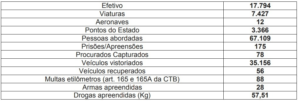 Foram empregados em todo o Estado de São Paulo 17.794 policiais militares, 7.427 viaturas (aeronaves, carros, motocicletas) e 12 aeronaves em 3.366 pontos de ações policiais. Graças às ações do policiamento preventivo e ostensivo, e ao trabalho conjunto com a comunidade, dentro da filosofia de polícia comunitária, foram obtidos os seguintes resultados: