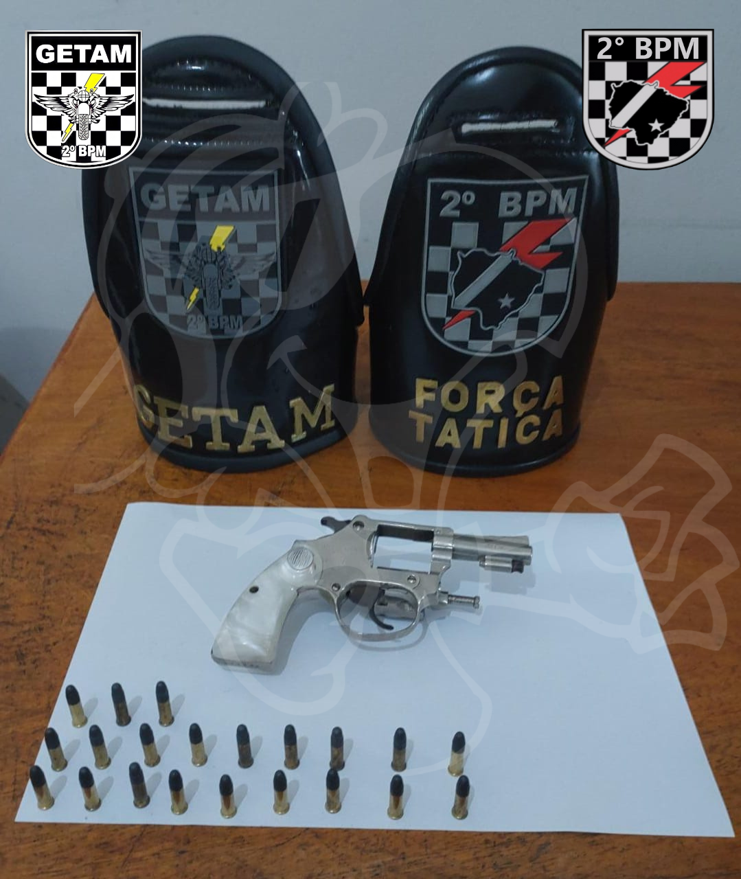 Além da arma, sete munições em um coldre, e uma caixa com 14 munições intactas foram encontradas pela Força Tática e GETAM.