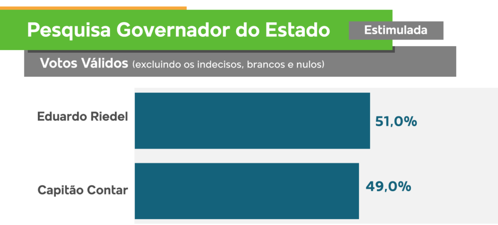 Levantamento realizado pelo instituto de pesquisa de opinião pública Novo Ibrape, entre os dias 4 e 9 de outubro, mostra a virada do candidato do PSDB, Eduardo Riedel, que venceria Renan Contar (PRTB) na corrida à governadoria de Mato Grosso do Sul com 51% dos votos válidos, isto é, excluindo-se os votos nulos, brancos e indecisos.