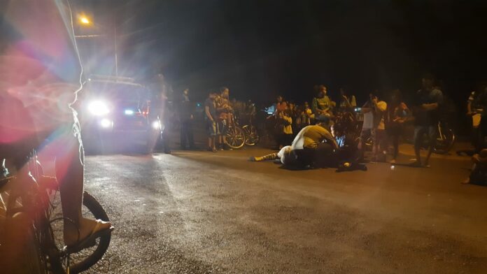 A Polícia Militar foi acionada, atendendo ao SAMU, onde no local, uma adolescente caiu ao solo após a roda de sua bicicleta enroscar na corrente, batendo a cabeça fortemente no asfalto.