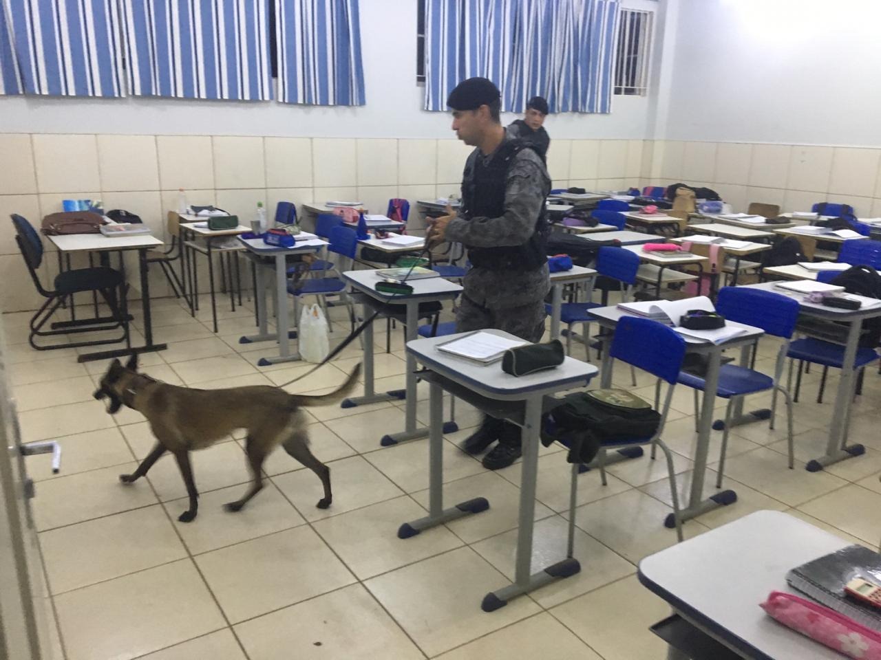 A abordagem na escola faz parte do Projeto Escola Segura e contou com o apoio de 7 polliciais e 3 viaturas, além de cão farejador.