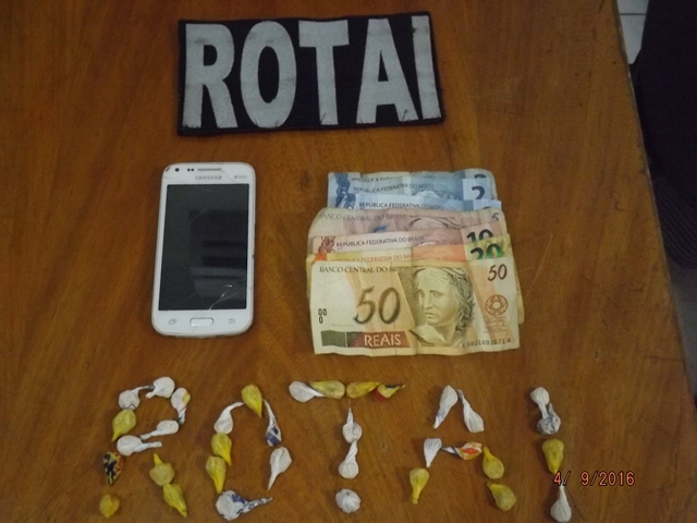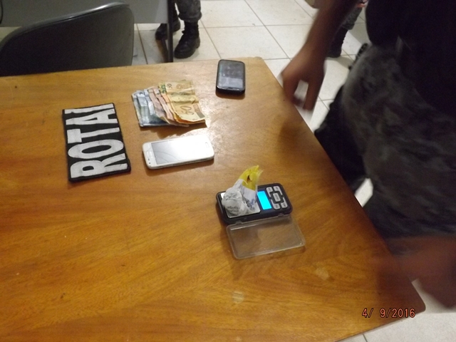 Após a revista a mulher foi identificada por J.R.S. (21 anos), próximo ao referido poste foram localizados dois invólucros, um de cor amarela contendo 15 porções fracionadas, prontas para venda, de substancia análoga a crack pesando aproximadamente 4,8g e outro de cor branca contendo 20 porções na mesma situação, com substancia análoga a crack pesando aproximadamente 5,6g e também a quantia de R$ 21,00 (vinte e um reais) que estava junto a droga.