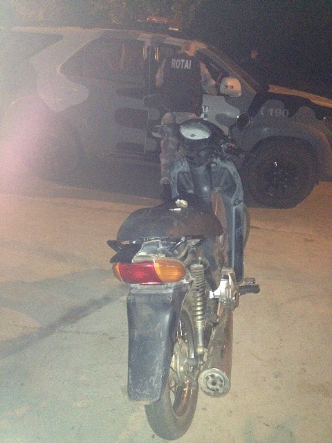 Ao verificar a motocicleta os soldados constataram que a partida do veículo estava sendo realizada com o auxilio de uma chave micha e também que a numeração do chassi havia sido suprimida por pingos de solda, sendo possível identificar a origem do veículo apenas pela numeração do motor que apontou que o mesmo era produto de furto, sendo que o veículo fora subtraído no dia 08 deste mês em frente à agência dos correios.