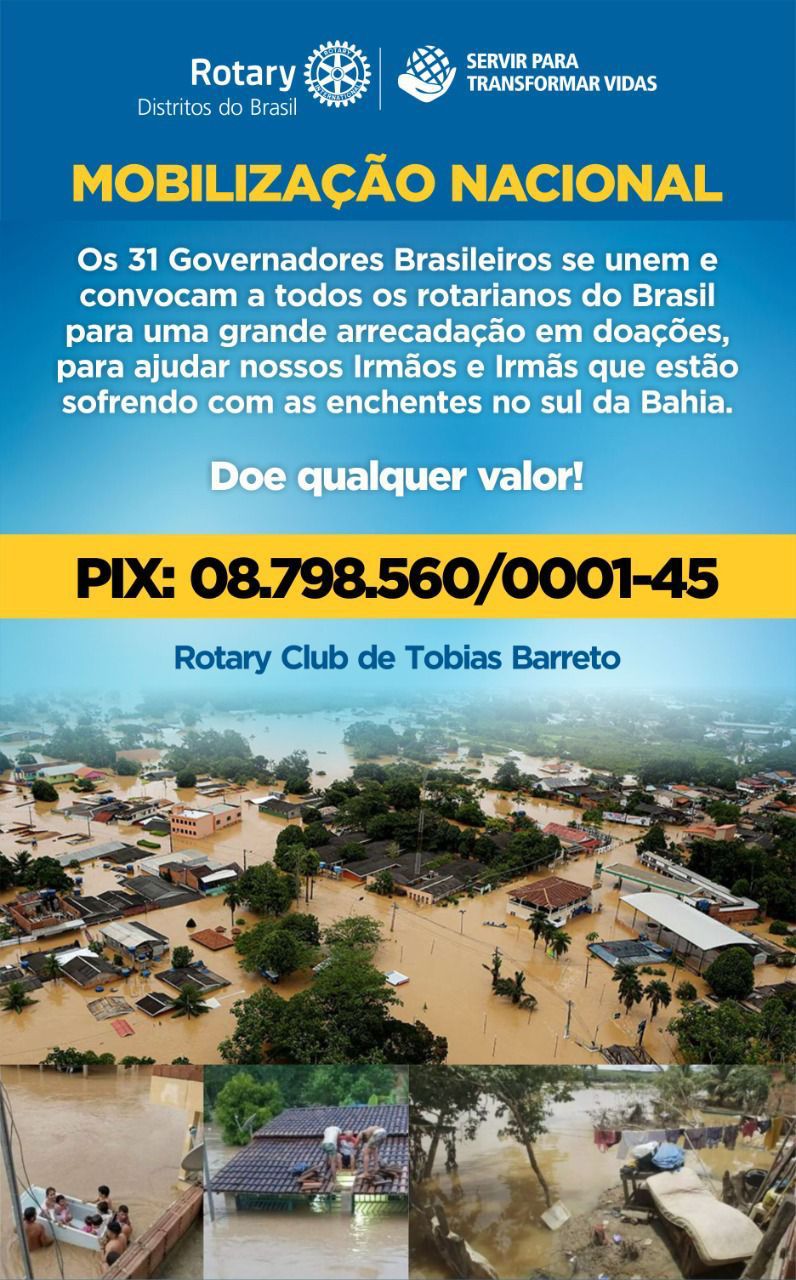 Brasil_. Para ajudar os que estão sofrendo com as enchentes no sul da Bahia, 31 governadores se uniram e convocaram todos os rotarianos do Brasil para uma grande arrecadação em doações. A população pode fazer uma doação em dinheiro de qualquer valor através da chave Pix: 08.798.560/0001-45.