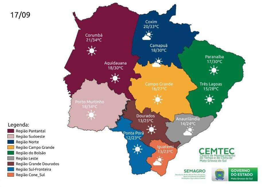 De acordo com o Cemtec (Centro de Monitoramento do Tempo e do Clima) o sábado (17) em Mato Grosso do Sul será de temperaturas amenas pela manhã e noite, mas a tarde pode ser quente em várias regiões. Não há previsão de chuva para o Estado e a umidade relativa do ar pode chegar aos 15%.