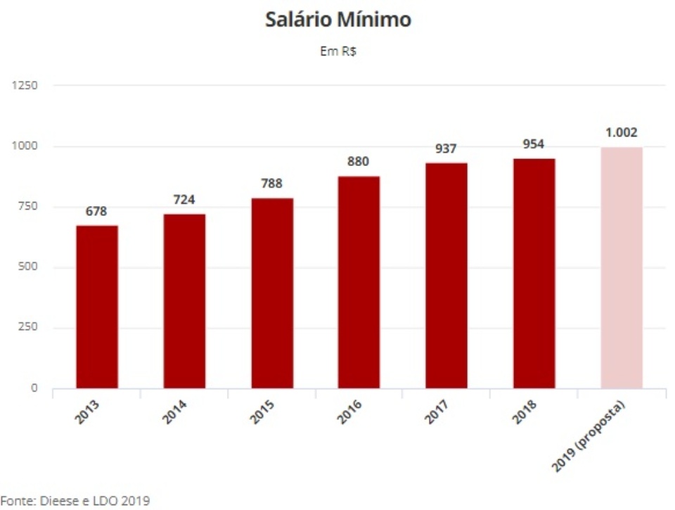 O governo propôs um salário mínimo de R$ 1.002 para 2019. O valor consta do projeto de Lei de Diretrizes Orçamentárias (LDO) do ano que vem, anunciado na última quinta-feira (12). Atualmente, o mínimo é de R$ 954.