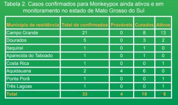 Com 33 casos no total, são 19 pessoas com o vírus ativo em Mato Grosso do Sul, e 18 que já se curaram. A doença não se mostrou letal, com apenas um óbito confirmado em todo o Brasil.