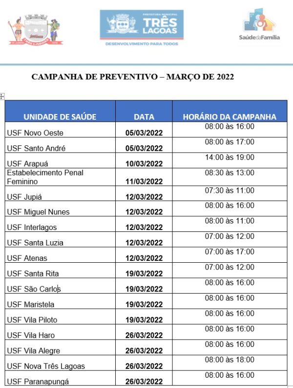 “O trabalho descentralizado por essas unidades, tem o objetivo de garantir as mulheres de Três Lagoas o acesso ao exame de forma precoce, O fortalecimento da prevenção ao câncer de colo uterino é uma das metas principais da saúde pública. Informo que além da campanha está sendo realizado durante os finais de semana, nossas unidades seguem oferecendo também durante a semana conforme expediente e agenda desses profissionais”, enfatizou Elaine Fúrio, secretária de Saúde.