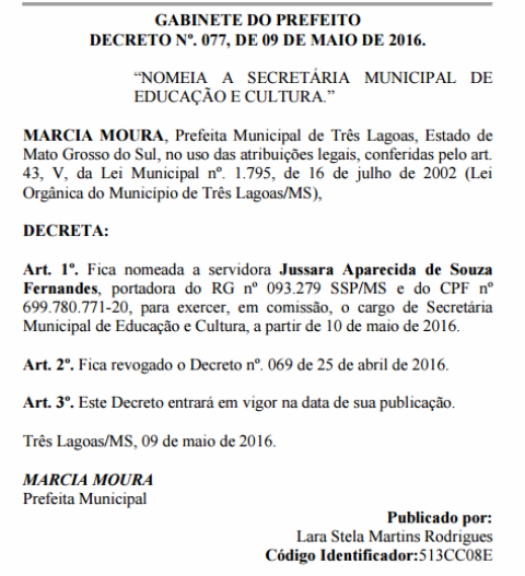 Para surpresa geral, foi publicado no Diário dos Municípios de Mato Grosso do Sul nesta terça-feira (10), que a prefeita Márcia Moura nomeou novamente a servidora Jussara Aparecida de Souza Fernandes, para exercer, em comissão, o cargo de Secretária Municipal de Educação e Cultura, a partir da data da publicação.