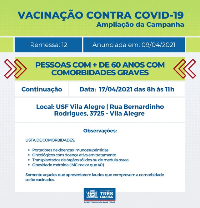 A ação será no próximo sábado (17), das 8h às 11h, na Unidade de Saúde da Família (USF) Vila Alegre e vai atender pessoas que apresentarem laudo médico que comprove que são portadoras de comorbidades graves, como: imunossuprimidas, oncológicos com doença ativa em tratamento, transplantados de órgãos sólidos ou de medula óssea e obesidade mórbida (IMC maior que 40).