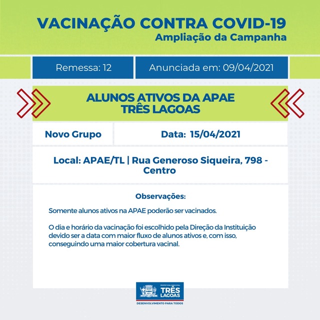 Alunos ativos da Associação de Pais e Amigos dos Excepcionais (APAE) também serão imunizados nessa semana, mais especificamente nesta quinta-feira (15), pois, segundo a direção da instituição, é a data ideal para a ação devido ao maior fluxo de pacientes no local.