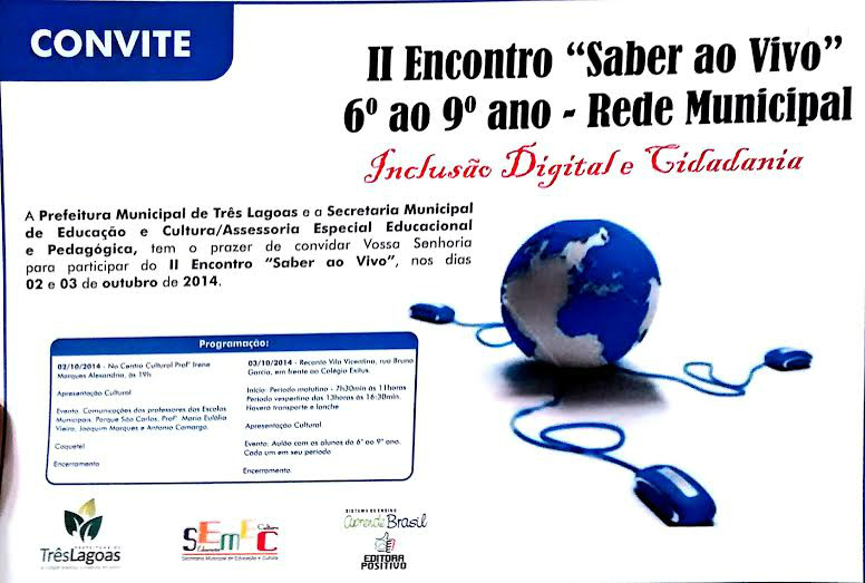 A Prefeitura de Três Lagoas, por meio da Secretaria Municipal de Educação e Cultura e Assessoria Educacional e Pedagógica, realiza nos dias 2 e 3 de outubro o II Encontro “Saber ao Vivo” que visa a Inclusão Digital e Cidadania. O evento engloba alunos do 6º ao 9º da Rede Municipal de Ensino (REME).