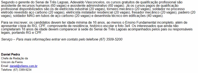 Diante a repercussão negativa, a direção de ambos os portais entraram em contato na manhã desta quinta-feira (28) com a assessoria de imprensa do SENAI em Campo Grande e em conversa com Daniel Pedra, foi repassada a real situação e a gravidade do problema após eles – SENAI – terem divulgados as oportunidades que na verdade, não estavam disponíveis aos três-lagoenses.