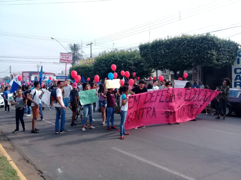 TRÊS LAGOAS (MS) – Na manhã desta terça-feira (13), Sinted (Sindicato dos Trabalhadores da Educação de Três Lagoas e Selvíria), trabalhadores da educação e alunos das Redes Estadual e Municipal de Três Lagoas realizam manifestação na área central da cidade contra a reforma da Previdência e contra o corte de verbas na Educação.