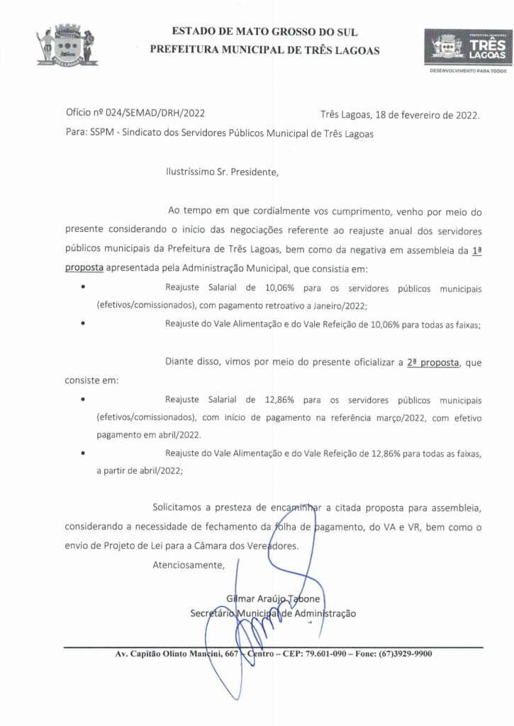 A proposta de 12,86%, vai ser aplicado no reajuste do vencimento já no próximo dia 01/04, antecipando por dois meses a data-base. O reajuste também será aplicado ao Vale Alimentação e no Vale Refeição dos servidores municipais, que alcançará também os servidores comissionados e os da Três Lagoas Previdência, autarquia municipal.
